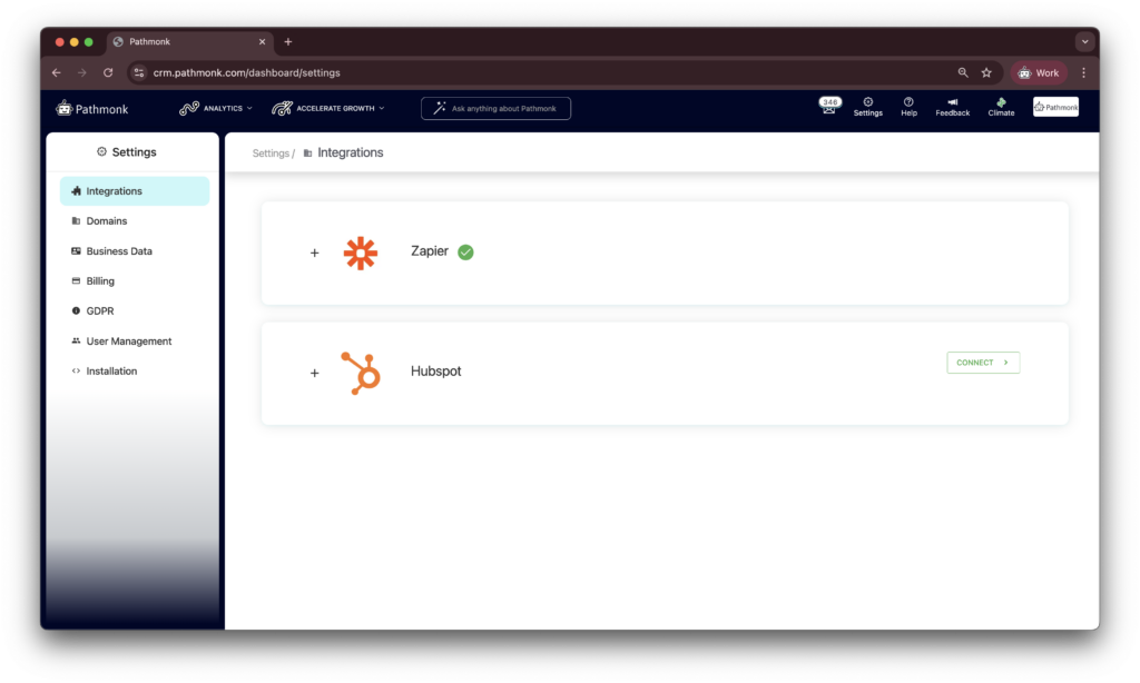 Once identified, you can push these leads directly into your CRM, sales engagement tools, or email marketing platforms. Simply go to our Integrations section, add Zapier, and connect Pathmonk to your existing workflows.